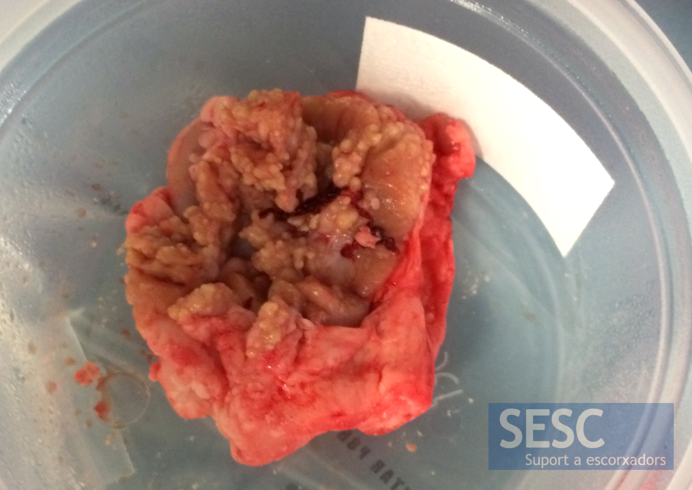 Tuberculosis has characteristic lesions that involve the presence of granulomas, especially in the respiratory lymph nodes (see Figures 1 and 2). It is therefore necessary to make an accurate diagnosis of all granulomatous lesions observed at slaughter. Laboratory analysis (histopathology , PCR , microbiological culture) allow to distinguish whether these lesions are caused by mycobacteria or other etiologies that cause similar macroscopic lesions such as fungi (see Figure 4), parasites, certain neoplasias, etc...